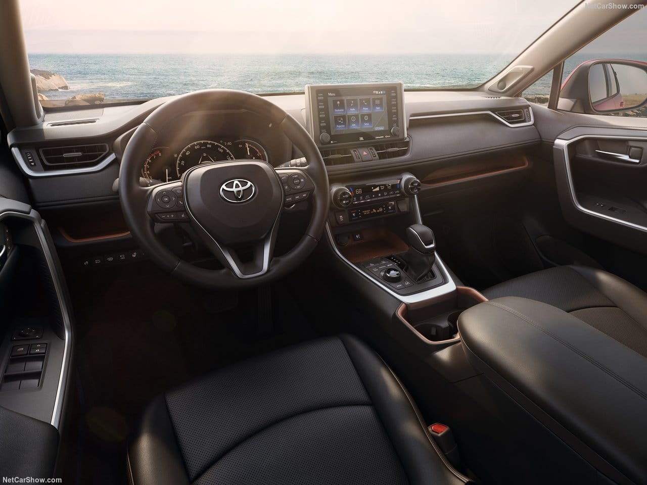 Po kabinie auta od razu poznamy, z jaką marką mamy do czynienia. Projekt deski rozdzielczej przypomina najnowszego Aurisa oraz crossovera C-HR. Podobnie, jak w poprzednim RAV4, przez całą szerokość kokpitu biegnie skórzany pas. Na tym jednak podobieństwa się kończą. W nowym modelu najbardziej w oczy rzucają się wolnostojący ekran multimediów o średnicy 7 lub 8 cali oraz umieszczone pod nim duże pokrętła od klimatyzacji.