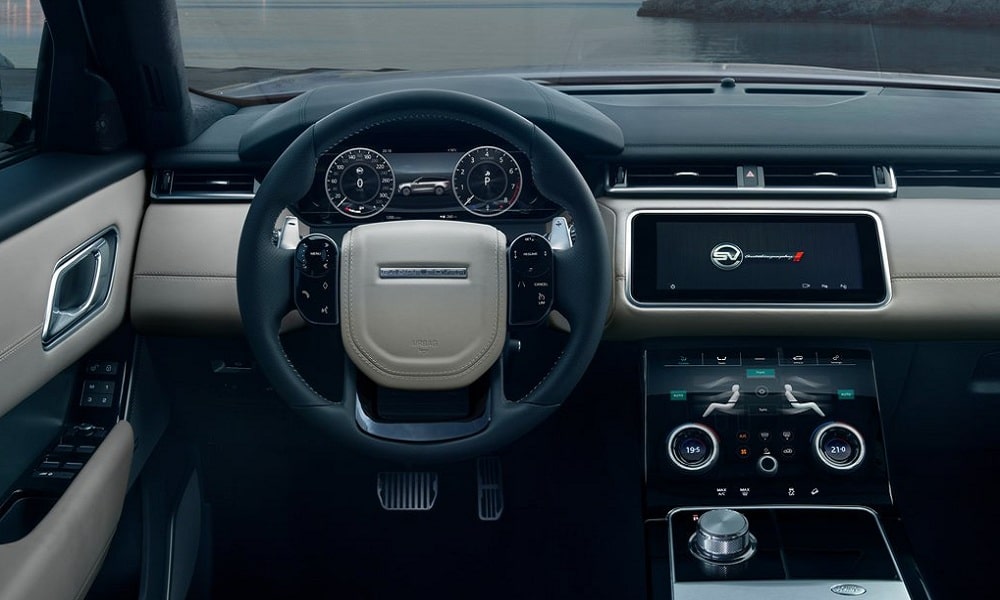 W kabinie Velara znajdziemy pikowaną tapicerkę skórzaną z podwójnym przeszyciem, sportową kierownicę ze specjalnie wyprofilowanym wieńcem i dotykowymi, aluminiowymi łopatkami do zmiany biegów oraz opcjonalny pakiet wstawek z włókna węglowego.