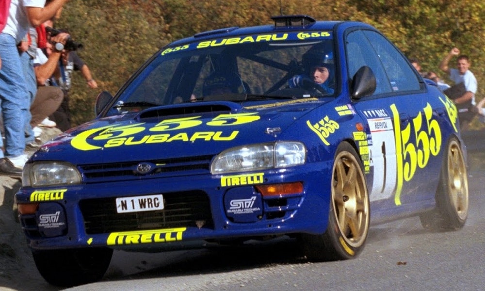 Kolejną zaletą boksera wykorzystaną przez koncern Fuji Heavy Industries była jego mała długość. Tak, pisałem o tym wyżej, ale w kontekście samego silnika – teraz chciałbym opisać, jak bardzo ta cecha wpłynęła na konstrukcję napędu na cztery koła Subaru, bo właśnie to w dużej mierze wpłynęło na sukcesy Imprezy. Dzięki krótkiej budowie możliwe było stworzenie zaawansowanej i skomplikowanej skrzyni biegów, która jednocześnie była zintegrowana z dyferencjałem przednim oraz centralnym, co znowu zaoszczędziło nieco wagi poprzez brak dodatkowych wałów. Napęd ten został nazwany Symmetrical AWD, ze względu na jego budowę. Gdyby przeciąć auto wzdłuż jego osi, dostalibyśmy lustrzane odbicia między lewą a prawą stroną samochodu zaczynając już od wału korbowego silnika, a na tylnym dyferencjale kończąc. Z racji tego, że silnik siedział bardzo nisko, to skrzynia biegów oraz wszystkie dyferencjały również, więc właściwości jezdne Imprezy były wprost z górnej półki. W ten sposób silnik i napęd S-AWD uzupełniały się nawzajem, tworząc spójną jedność. Pierwsza generacja pod nazwą kodową GC, wśród fanów marki przygarnęła sobie pseudonim mean-eye, od swojego wrednego i agresywnego przodu. Uzbrojona we wszystkie powyższe aspekty, była maszyną skazaną na sukces. Czterocylindrowy bokser za pomocą turbosprężarki IHI, osiągał 360 KM przy doładowaniu prawie dwóch atmosfer, jednak w większości rajdów wartość tą zmniejszono do bezpieczniejszych 330 KM.