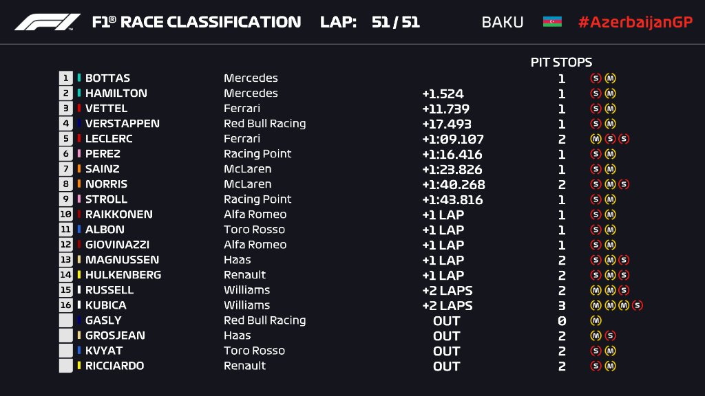 Dla Valtteriego Bottasa to zupełnie zasłużona wygrana po zeszłorocznym koszmarze z przebitą oponą. Fin zdobył w sobotę pole position, a w niedzielę obronił się przed Lewisem Hamiltonem (głównie zaraz po starcie) i pojechał kapitalny wyścig. Dzięki wygranej 29-letni kierowca ponownie zajmie pierwsze miejsce w klasyfikacji generalnej, wyprzedzając Hamiltona o punkt.