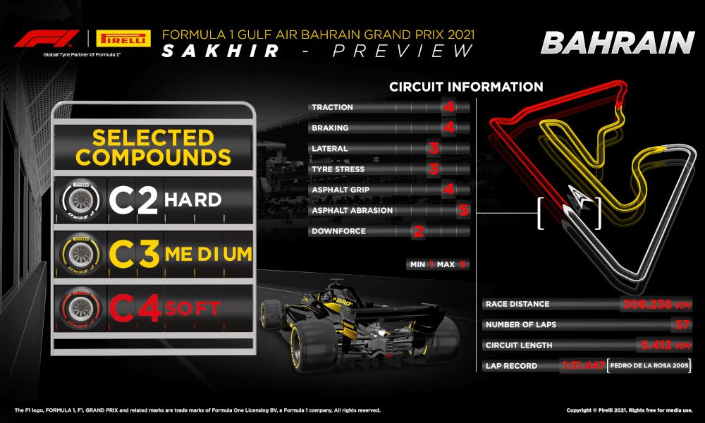 Na GP Bahrajnu, Pirelli przygotowało mieszanki opon C2-C4, czyli dokładnie takie, jak w zeszłym sezonie. Jednak na 2021 rok, włoski producent przygotował nowe opony, które również stanowią pewną zagadkę dla zespołów i kierowców.