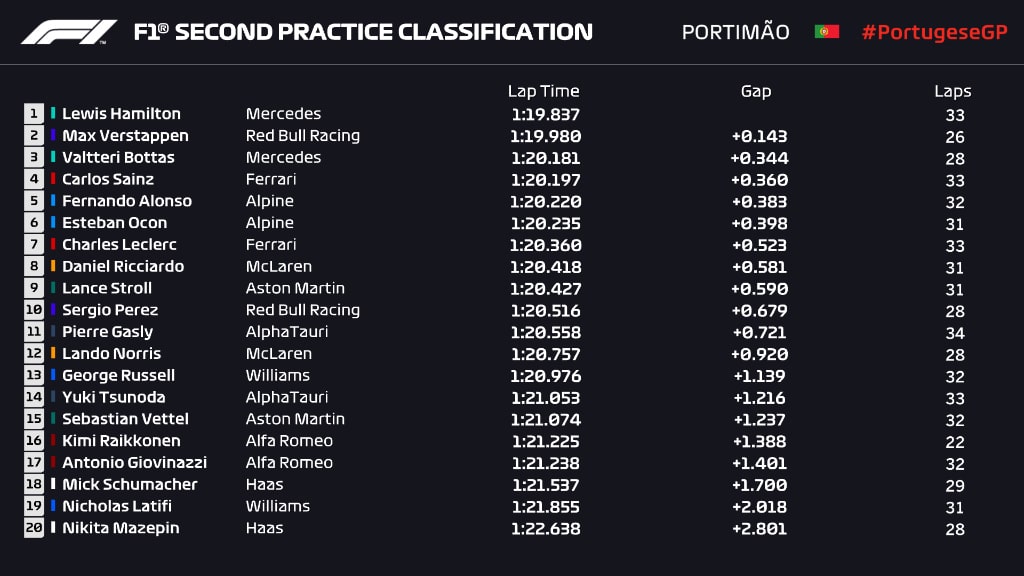 Holender również może zaliczyć piątek do naprawdę udanych. Choć nie uplasował się przed kierowcami Mercedesa to w pierwszym treningu ustąpił Bottasowi tylko o 0,025 sekundy. Po południu było tylko nieco gorzej – Verstappen stracił do Hamiltona 0,143 sekundy na szybkim okrążeniu. Nie jest to jednak przewaga nie do odrobienia. Różnice między Mercedesem, a Red Bullem są minimalne i w kwalifikacjach może się okazać, że stabilniejszy w zachowaniu RB16B zyska przewagę na nieprzewidywalnej i śliskiej nawierzchni toru Algarve.
