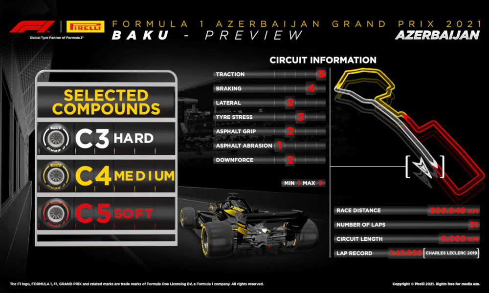Kolejną zmienną, którą kierowcy i zespoły będą musieli wziąć pod uwagę stanowią opony. W przeciwieństwie do weekendu w 2019 roku, Pirelli postawiło na mieszanki o jeden stopień miększe (od C3 do C5). Jest to zrozumiały krok włoskiego producenta, gdyż Baku jak każdy tor uliczny jest kompletnie nienagumowany, a degradacja opon jest na nim znikoma. Większa przyczepność z pewnością ułatwi kierowcom przygotowania do kwalifikacji i wyścigu i być może zapobiegnie niepotrzebnym kraksom w trakcie treningów.