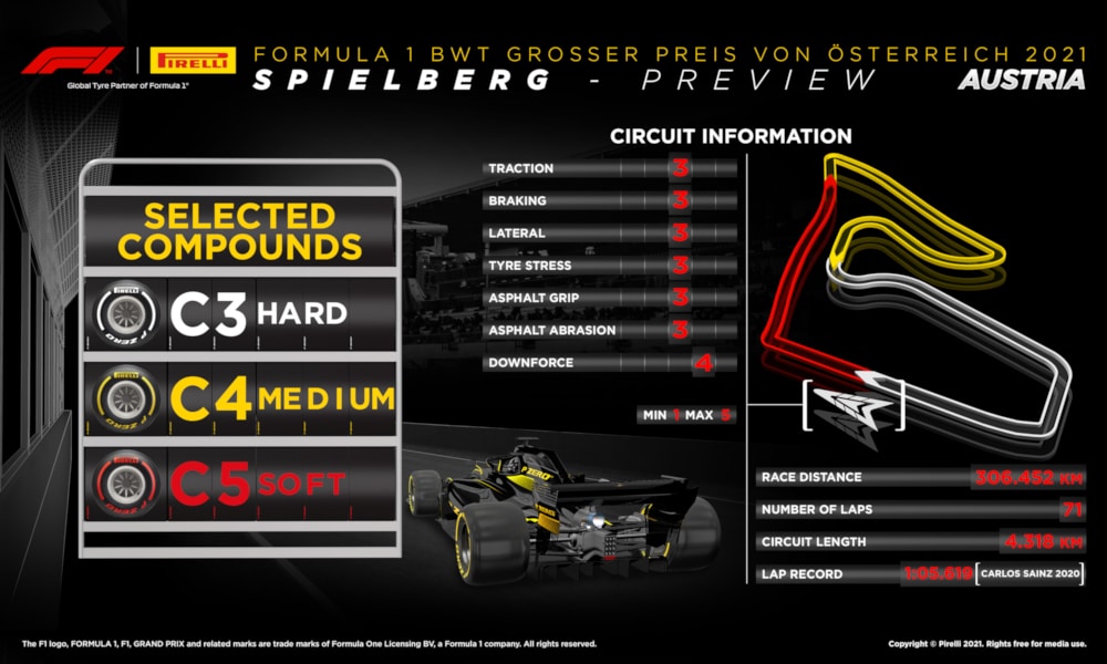 Najważniejszym czynnikiem mogącym wpłynąć na wyniki rywalizacji będą opony. Na GP Austrii, Pirelli przywiezie najmiększy zestaw mieszanek – od C3 do C5. W czasie zeszłotygodniowego GP Styrii były to opony stopień twardsze (od C2 do C4), a co za tym idzie mniej przyczepne, ale bardziej wytrzymałe. Włoski producent sięga więc po patent znany z GP 70-lecia w 2020 roku, gdy zmiana opon na miększe znacząco odmieniła obraz rywalizacji i pozwoliła Maxowi Verstappenowi przerwać „monopol na zwycięstwa” Mercedesa.