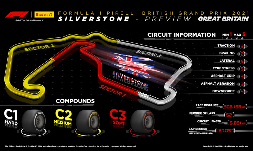 Jakby tego było mało, licząca 5,891 km długości nitka pokryta jest bardzo szorstkim asfaltem. W połączeniu z licznymi przeciążeniami bocznymi stanowi to niemal zabójstwo dla opon. Nic dziwnego, że w tej sytuacji Pirelli tradycyjnie już (wyjątkiem było zeszłoroczne GP 70-lecia) przywiezie na Silverstone najtwardszy zestaw opon – od C1 do C3.