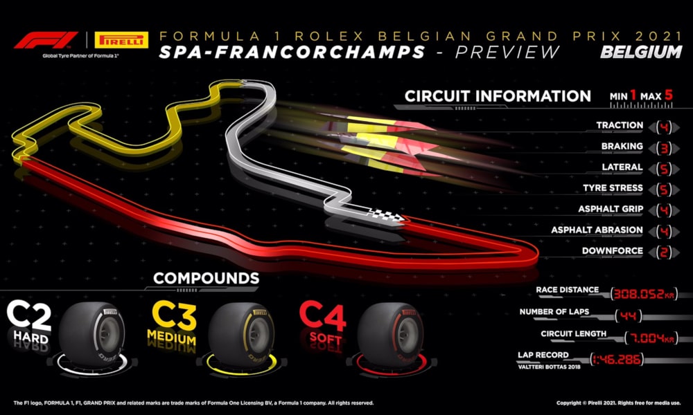 Pirelli przywiezie do Belgii standardowy pakiet mieszanek dla Spa-Francorchamps – od C2 do C4. Wiele wskazuje jednak na to, że zespoły w ogóle ich nie wykorzystają. Prognozy pogody wskazują, że cały weekend będzie deszczowy oraz bardzo chłodny. Temperatura nie przekroczy 17 °C, a opady w górach zazwyczaj są bardzo gwałtowne i wprowadzają niemały chaos na torze.