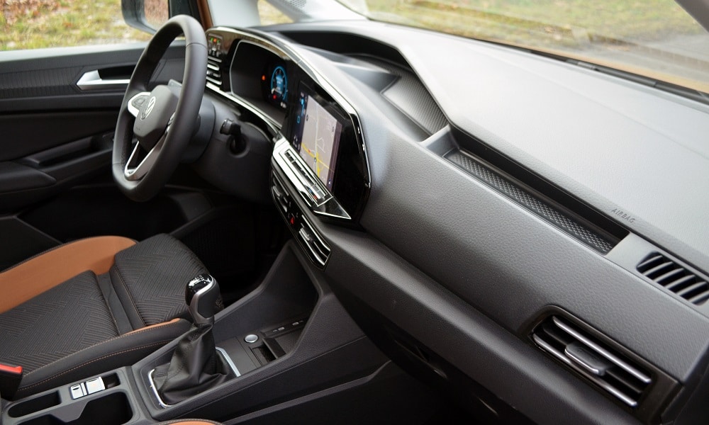 Kabina testowanego Caddy PanAmericana prezentuje się bardzo nowocześnie i ładnie jak na samochód o użytkowym rodowodzie. Kokpit wygląda niczym żywcem wyjęty z nowego Golfa. Oczywiście tworzywa są twarde, zarówno na desce rozdzielczej jak i na drzwiach, jednak wszystko zmontowano solidnie, zaś nawet twarde plastiki są dobrej jakości i dość przyjemne w dotyku. Kabina jest wolna od trzasków (z pewnym wyjątkiem, o którym zaraz wspomnimy), z kolei panele drzwi i podłokietniki wykończono tapicerką. Wspomnieliśmy o pewnym wyjątku – otóż podczas jazdy po nierównych drogach obecny w naszym egzemplarzy stały dach panoramiczny (3840 zł) potrafił hałasować, jednak skutecznie doświetlał wnętrze.