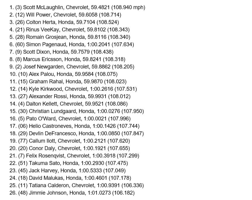 Obok Scott McLaughlina ustawi się jego kolega z zespołu Will Power. Australijczyk znany z niezwykłej porywczości z pewnością był zdziwiony tym, co się stało. Mistrz IndyCar z 2014 roku spodziewał się raczej, iż prędzej o pole position powalczy z Josefem Newgardenem niż z nim. Amerykanin jednak nawet przebrnął drugiej części kwalifikacji. Z drugiego rzędu wystartują Colton Herta i Rinus Veekay.