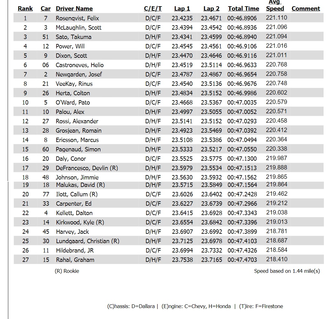 Na przeciwległym biegunie znalazł się za to Christian Lundgaard. Duńczyk, który brylował w testach dla debiutantów przed kilkoma dniami kompletnie przepadł. Skandynaw bowiem zdołał uplasować się wyżej tylko od J.R-a Hildebranda i Grahama Rahala. Z dziennikarskiego obowiązku warto dodać, iż 18. lokata, którą wywalczył Jimmie Johnson jest jego najlepszą pozycją w kwalifikacjach jaką Amerykanin zajął w czasie swojej kariery w IndyCar.