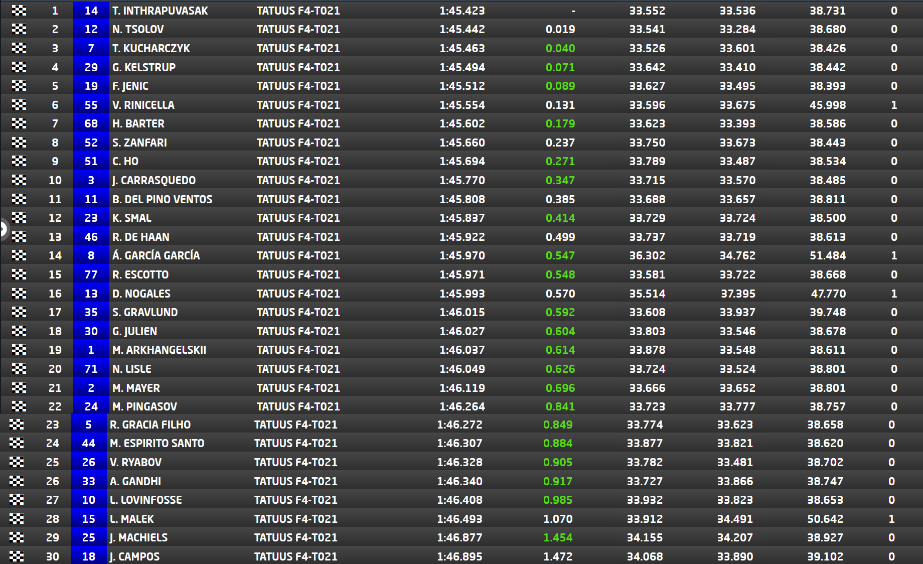 Wydawało się, iż Nikola Tsolov i Tymoteusz Kucharczyk po raz kolejny rozstrzygną między sobą walkę o pole position. Jak pokazał czas, los zadecydował inaczej. Bułgara i Polaka pogodził bowiem Taj Tasanapol Inthraphuvasak, który w sobotę wywalczył miejsce dopiero w 3. rzędzie. Reprezentant ekipy MP Motorsport stopniowo poprawiał swoje czasy, aż wreszcie mniej więcej na 3 minuty do końca sesji, zdołał wykręcić swój najlepszy. Dla Taja to 4. pole position w jego karierze w wyścigach Formuły 4. Dodatkowo dzięki zwycięstwu w kwalifikacjach, do swojego dorobku punktowego dopisał 2 punkty. Czołową trójkę uzupełnili Tsolov i Kucharczyk, których strata do niego nie była wielka, o czym opowiemy sobie niżej.