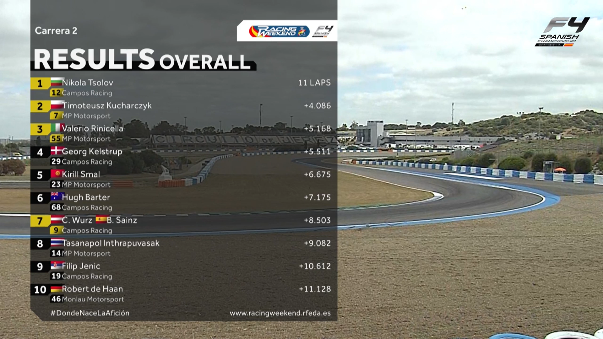 Cóż za jazda młodego Bułgara! Podopieczny Alpine prowadził od start do mety, a dodatkowo ustanowił najszybszy czas pojedynczego okrążenia w wyścigu. Jazda Tsolova nie była jednak w pełni tak perfekcyjna. Kierowca ekipy Campos Racing bowiem tuż po restarcie na przestrzeni kilkuset zblokował koła 3 razy. W ostatecznym rozrachunku nie wpłynęło to na tempo bohatera akapitu, który pomknął po 2. wiktorię w karierze w Hiszpańskiej F4.