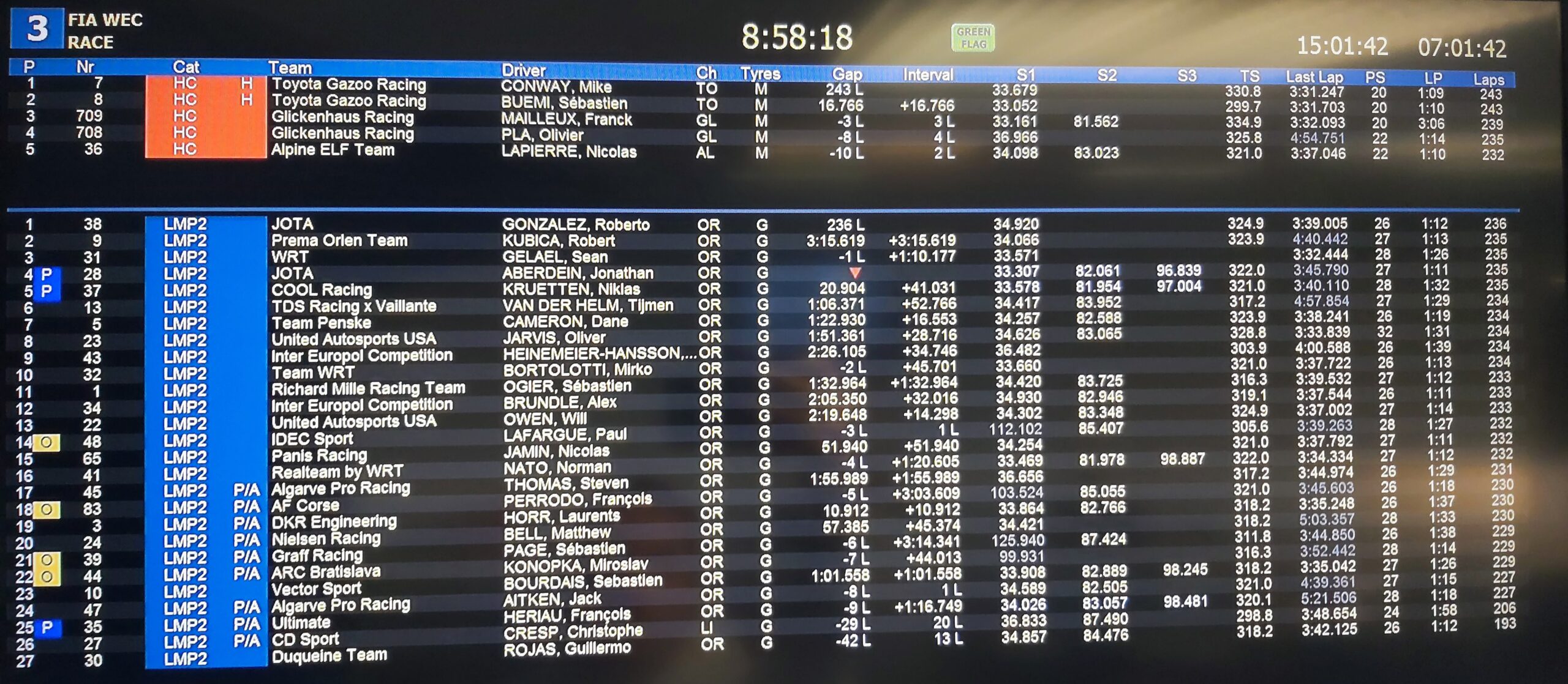 Jako że Alpine i Glickenhausy są zbyt daleko od siebie, aby zapewnić walkę w klasie Hypercar to to zadanie przejęła Toyota. Od początku wyścigu co jakiś czas mieliśmy okazję obserwować zamiany pozycji pomiędzy siódemką, a ósemką. Wprawdzie głównie wynikały one z problemów przy postojach czy też błędów zawodników. Jednak wobec dominacji japońskiej marki w tym wyścigu to jest jedyna szansa, na doświadczenie walki na czele stawki. Taki pojedynek potrwa nam najprawdopodobniej do godz. 15:00 czasu polskiego. Po tej godzinie obydwie załogi zjadą na swój ostatni zjazd, po którym zwykle Toyota już nie zgadza się na walkę pomiędzy załogami.