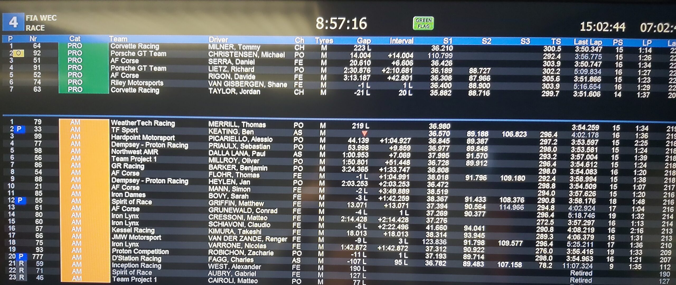 W GTE Am nadal to niemiecki producent dominuje pod względem ilości aut w pierwszej szóstce. Jednak to TF Sport przejęło prowadzenie o świcie. Brytyjska ekipa jest obecnie na dobrej drodze do powtórzenia triumfu z 2020 roku. Jednak nie należy jeszcze skreślać Porsche, które od startu do świtu cały czas było na prowadzeniu i dopiero w ostatniej godzinie zaczęli tracić.