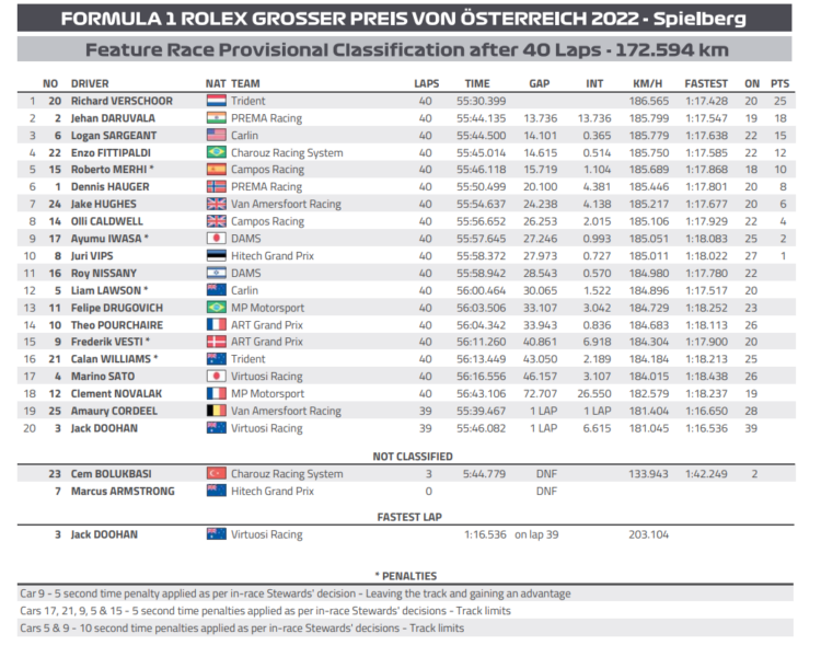Takie wyścigi jak ten z pewnością wprowadzają wiele emocji. Gdy liderzy zawodzą, pojawiają się szanse dla teoretycznie słabszych zawodników. Choć czołówka klasyfikacji się nie zmieniła – nadal liderem jest Felipe Drugovich, kierowcy nie mają powodów do zadowolenia. Brazylijczyk zakończył zawody na 13. miejscu, a Theo Pourchaire dojechał tuż za nim. Dla porównania, będący trzeci w klasyfikacji Logan Sargeant uplasował się na najniższym stopniu podium. Zagrożenie w walce o mistrzostwo stanowi również Jehan Daruvala. Hindus, obecnie sklasyfikowany na 4. pozycji w „generalce”, zajął w Austrii drugie miejsce, co przybliża go do walki o podium. Najlepszą piątkę bieżącego sezonu zamyka Richard Verschoor, który w Austrii triumfował.