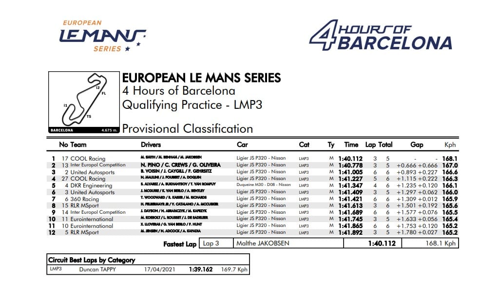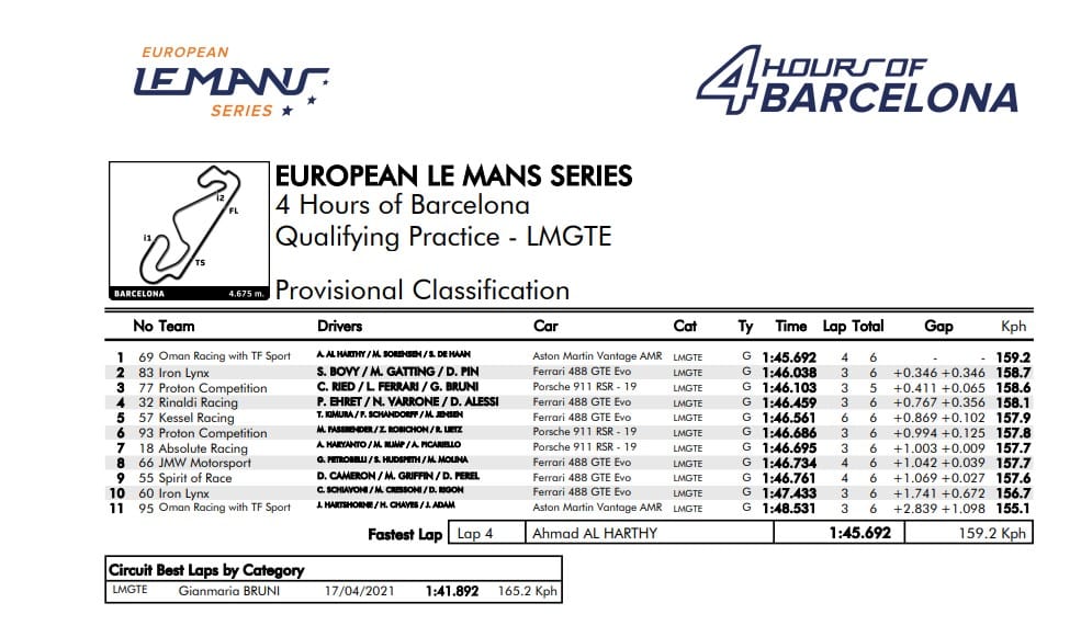 Jednak największe zamieszanie nastąpiło w ostatniej minucie sesji. Najpierw na pierwsze miejsce wrócił Yifei Ye z Cool Racing. Niestety Chińczyk nie na długo cieszył się pierwszą lokatą. Ostatnie słowo należało do Nicolasa Jamina, który z czasem 1:34.802 zgarnął pole position dla Panis Racing do 4h Barcelona! Rzutem na taśmę załoga #28 spadła jeszcze na czwartą lokatę po tym, jak do pierwszej trójki weszło Team Turkey. Turecka ekipa tym samym zdobyła pole position w podklasie Pro-Am. Piąte miejsce zdobyło AF Corse przed TDS. W czwartym rzędzie zobaczymy jutro dwa zespoły, które mogą zainteresować polskich kibiców. Siódmą pozycję wywalczyła Prema z Deletrazem, a obok niej ustawi się #43 Inter Europol Competition.