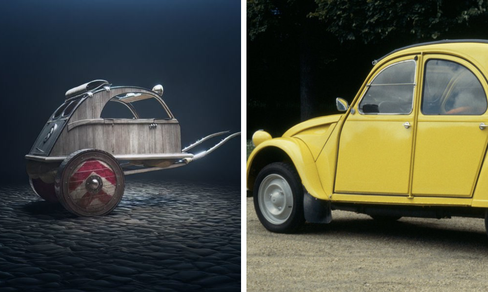 Prekursor samochodu używa amortyzatorów z żołądków dzików, kołpaki tworzą tarcze, a drogę bohaterom filmu mają oświetlać reflektory. Jednak tutaj zamiast nowoczesnej technologii wykorzystano prostsze rozwiązanie. Mowa tutaj o świetlikach z Galii zamkniętych w reflektorach. Ponadto w skład podstawowego wyposażenia 2CV wchodzi bagażnik z Galijskiej stali, korpus z litego drewna dębowego i dach wykonany z płótna luteńskiego.