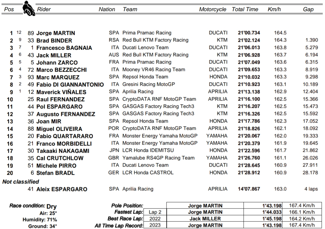 Hiszpan potwierdził swoją fantastyczną prędkość, zdobywając pole position w kwalifikacjach. Następnie zawodnik Pramac Racing po starcie „wymeldował się” odskakując od razu na ponad sekundę. Dalej „Martinator” pokazał takie tempo, które pozwoliło mu utrzymać rywali za sobą bez większego problemu. To była kolejna ważna wygrana w sprincie dla losów mistrzowskiego tytułu. Tym samym Jorge Martin zmniejszył stratę do Bagnai z trzynastu do ośmiu punktów. Walka o końcowy triumf robi się coraz ciekawsza!