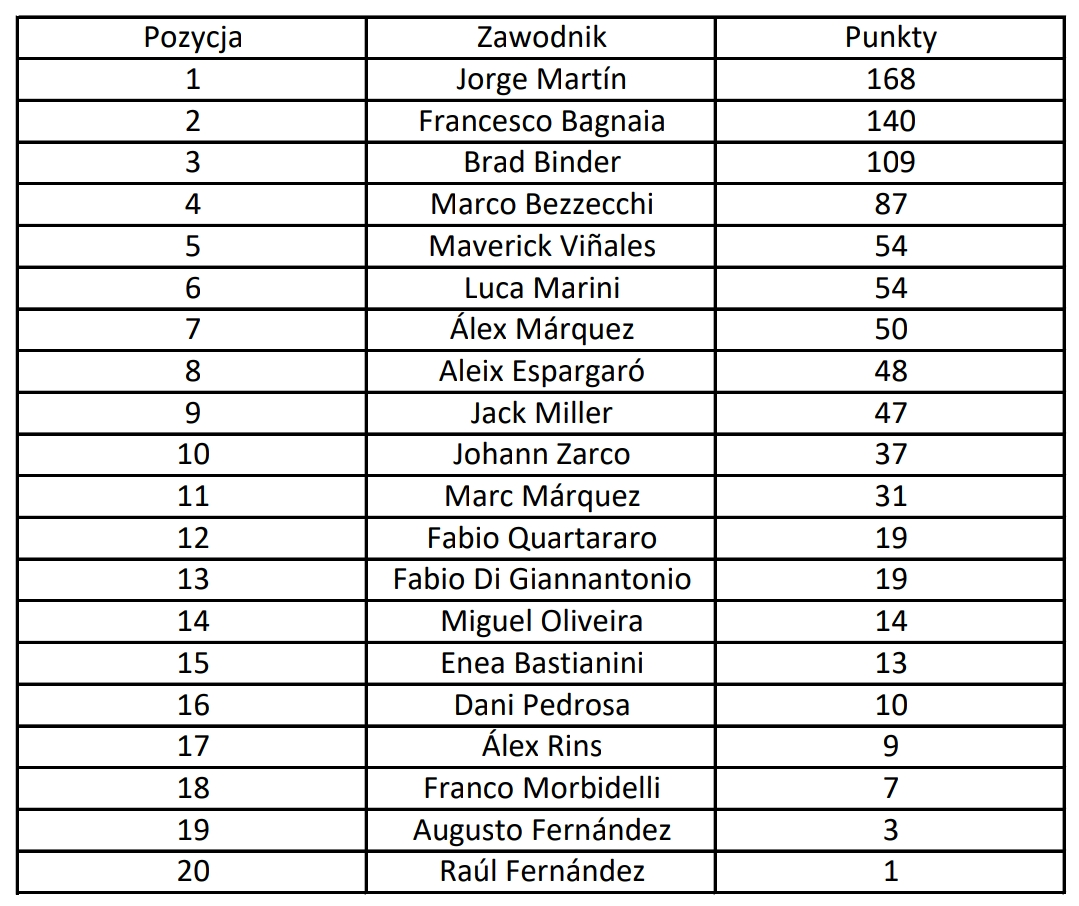 Do tego rzeczywiście wpłynęły one na walkę o mistrzostwo świata. Dzięki nim Jorge Martin mógł w ogóle mógł walczyć o mistrzostwo świata. Bez nich Bagnaia mógłby obronić tytuł już w Malezji. Innym beneficjentem zmodyfikowanego formatu był też Brad Binder. Natomiast Johann Zarco stracił na tym dość sporo. Poniżej zamieściliśmy tabele obrazujące to, jak punktowali poszczególni zawodnicy w sprintach oraz wyścigach Grand Prix.