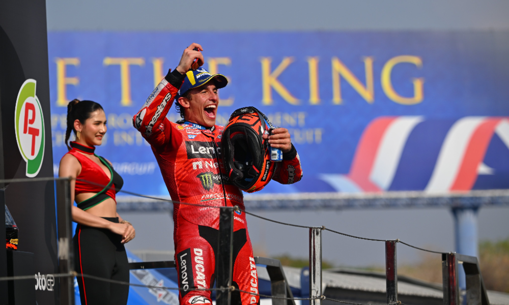 Piekielnie gorąca pogoda w Tajlandii nie była straszna dla 9-krotnego mistrza świata. Marc Marquez zakończył swój pierwszy weekend w barwach fabrycznego Ducati jako zdobywca pole position, zwycięzca sprintu oraz zwycięzca Grand Prix. Nie obyło się jednak bez problemów oraz walki z młodszym bratem.